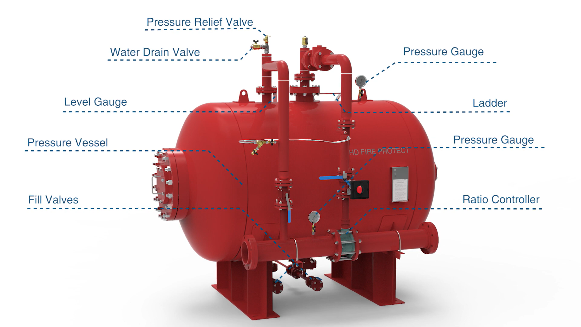 A bladder tank is a specialized storage device used in firefighting systems. It is designed to hold foam concentrate and water in separate compartments. When activated, the foam concentrate and water are mixed to create a foam solution that can quickly extinguish fires.